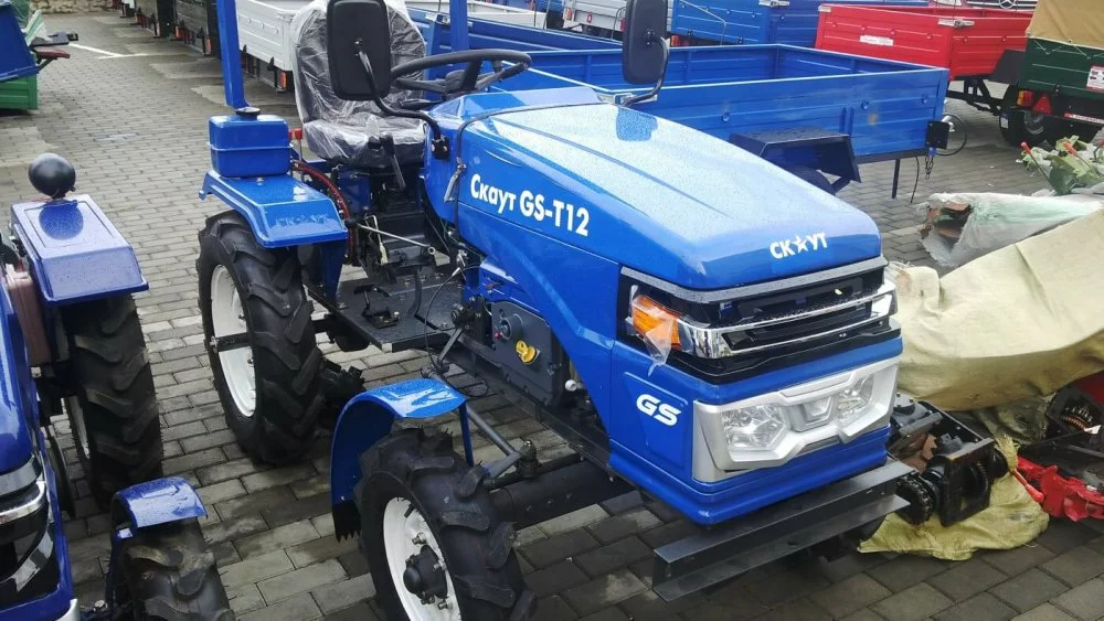 Трактор Скаут GS-T12 модель 2016 року — це найпопулярніша модель міні-трактора без кабіни, яка призначена для використання в малих господарствах для використання в різних сільськогосподарських роботах. Трактори такого класу — відмінна альтернатива важким дизельним мотоблокам з водяним охолодженням, фізичне навантаження при роботі з якими хоч і зведена до мінімуму, але все-таки присутня. Так само, це відмінна альтернатива великому трактору, вартість якого починається від суми, що втричі перевищує вартість трактора Скаут T-12DIF.